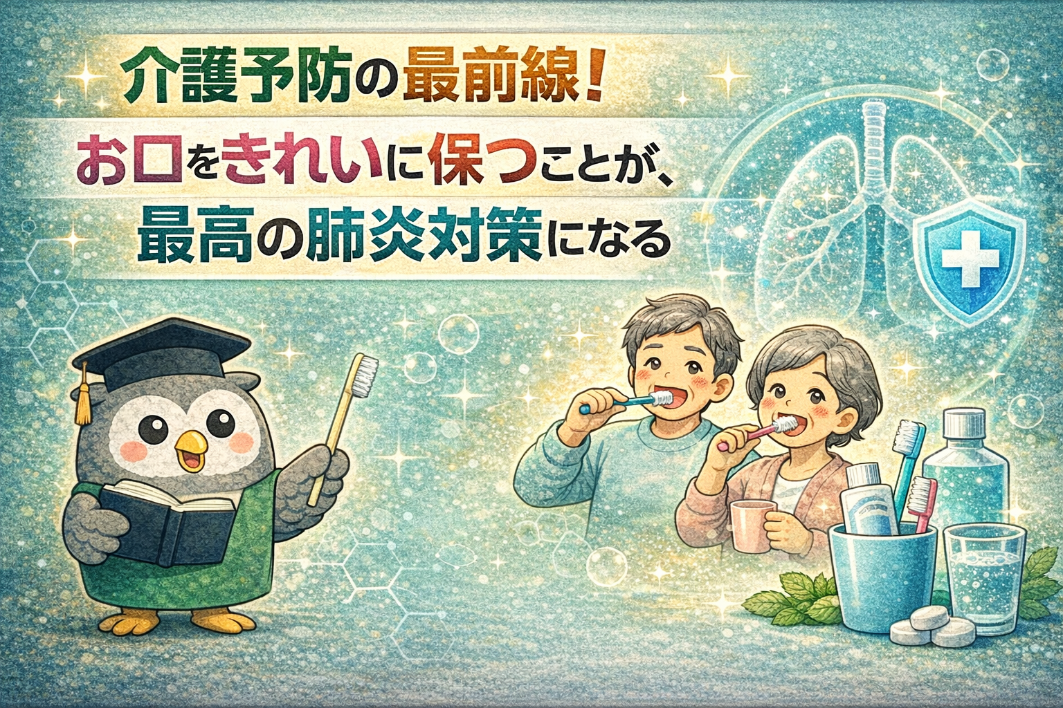 今日からは、歯+舌(+入れ歯)の清潔保持で“肺炎を遠ざける口腔ケア”を始めましょう。